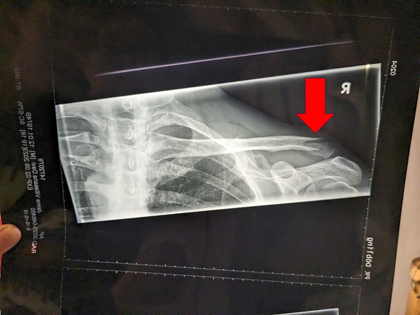 Llegué a emergencias de un hospital pequeño, me registré, tardaron algo en atenderme, supongo por ser sábado en la tarde/noche. Llega el doctor y me pregunta que me pasó, le explico. Me toma radiografía y me la muestra y me dice; es una fractura en clavícula como puedes ver cerca del hombro. Es simple y no múltiple, además no es expuesta. Tienes dos opciones: a) operar, significando una recuperación más pronta; b) usar banda porta brazo, tarda más en recuperar (hasta cuatro semanas). Le pregunto cuál es el estándar; me dice la banda porta brazo. Le digo quiero ello. Me recetó solamente pastillas para el dolor. Nada para lo inflamado. Esa noche tomé una pastilla para el dolor y aun con ella el dolor era algo intenso. Tomar baño fue complicado y dormir todavía peor. Paso la noche semi sentado en la cama debido al dolor.