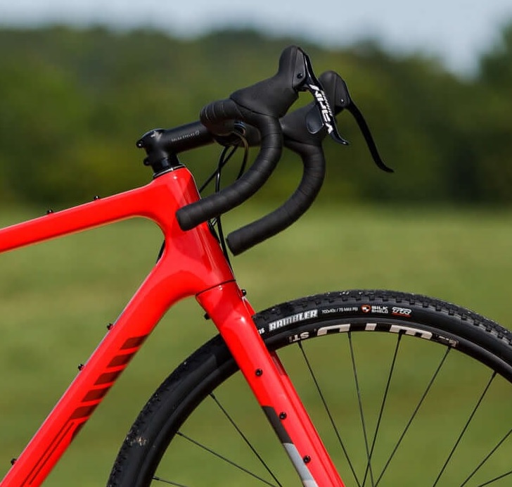 Los neumáticos son los Maxxis Rambler de 40mm, que son específicos para el uso Gravel. Son cubiertas que te permiten rodar de manera alegre por cualquier terreno. La parte frontal viene con tacos con lo que si vienes del mundo del asfalto, no vas a rodar tan ágilmente. Siempre puedes decantarte por otros neumáticos de Gravel que la banda de rodadura sea completamente lisa, como los Maxxis Razzo.